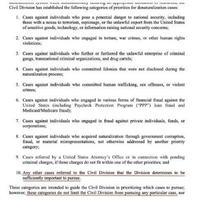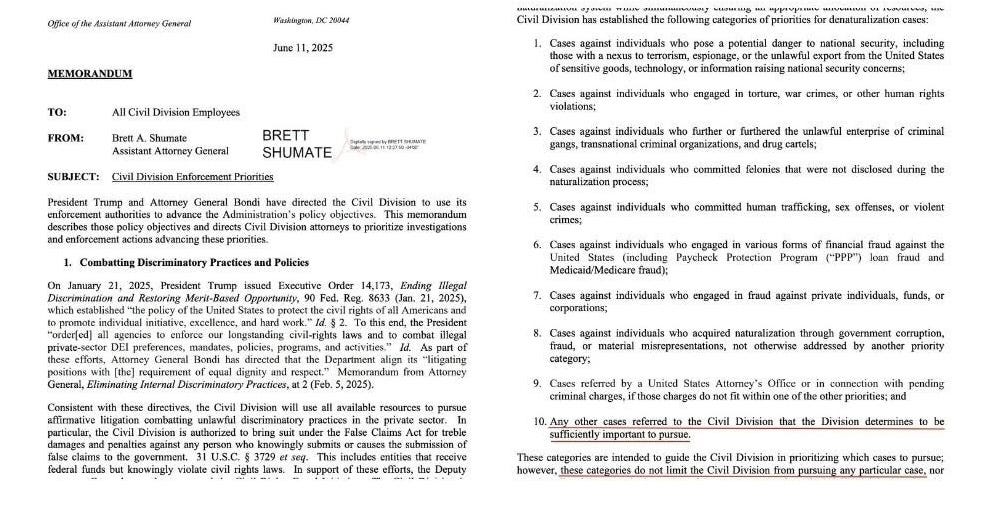 Fast-forward to June 11, 2025, when the inevitable directive from the Office of the Attorney General of the U.S., finally was released on the 10 categories of ‘priorities for denaturalization cases.’
